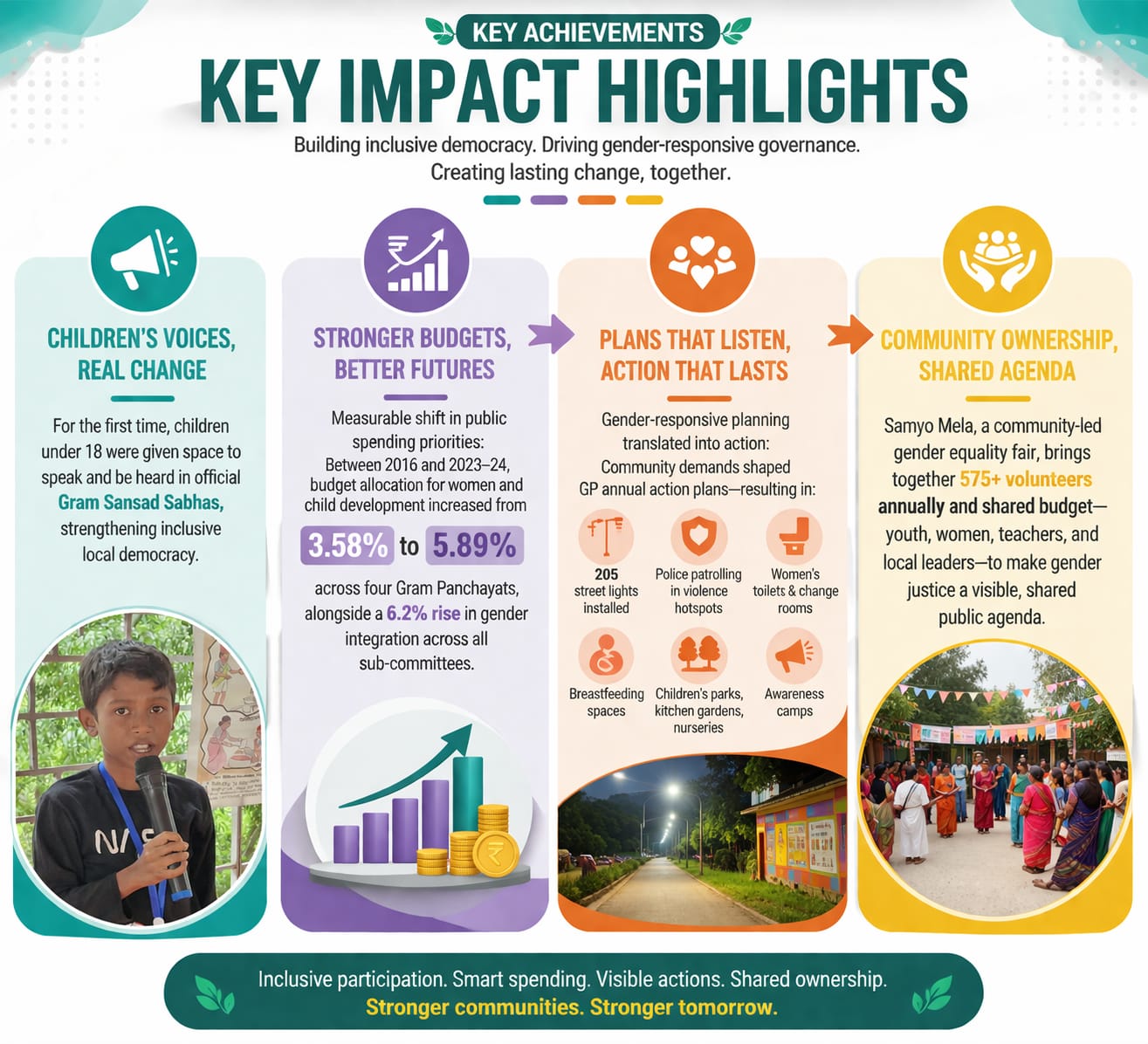 Enabling and improved ecosystem around women and children by creating inclusive practices among GPs & institutions to particularly around rights, safety and protection.